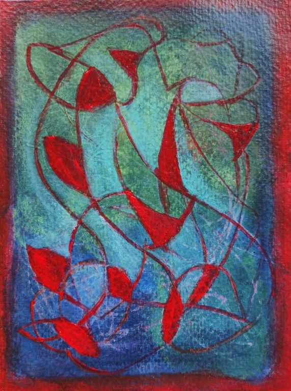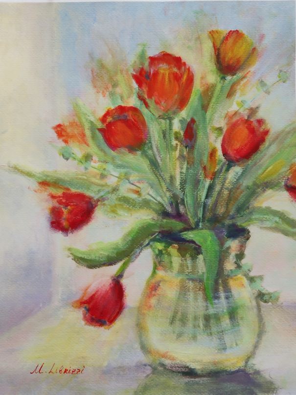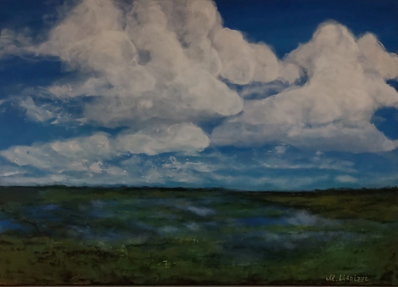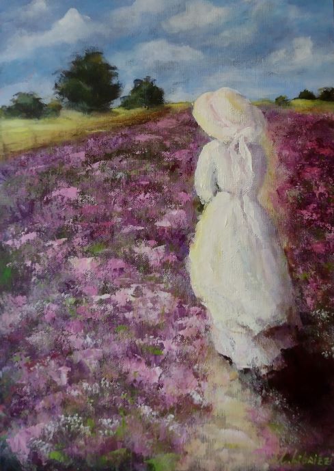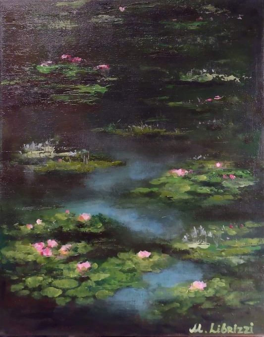 Den stille vandflade med åkander og de tomme både skaber en atmosfære af ro og eftertænksomhed. De hængende grene fra piletræet giver en drømmende fornemmelse, mens lyset, der blødt filtrerer gennem træerne, tilføjer en varm og harmonisk tone. Farvepaletten med de bløde grønne, blå og rosa nuancer forstærker følelsen af stilhed og naturens skønhed. Det føles som et øjeblik af stilstand, hvor tiden næsten går i stå i en idyllisk og næsten magisk verden.